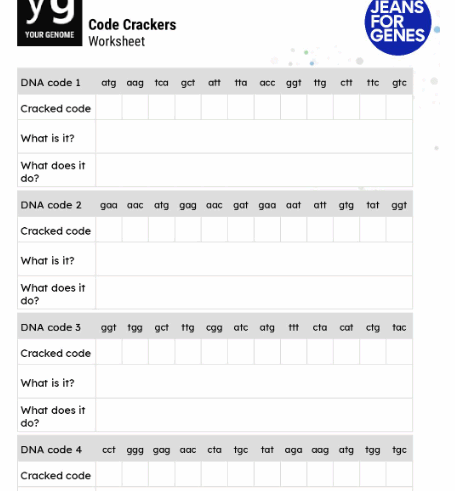 In this activity, learners will use a code cracker wheel to decode sequences of DNA into protein sequences. Then, using protein profile cards they will find out what these proteins do by matching our sequences to the protein sequences on the cards. The activity can be carried out individually or in teams of four.